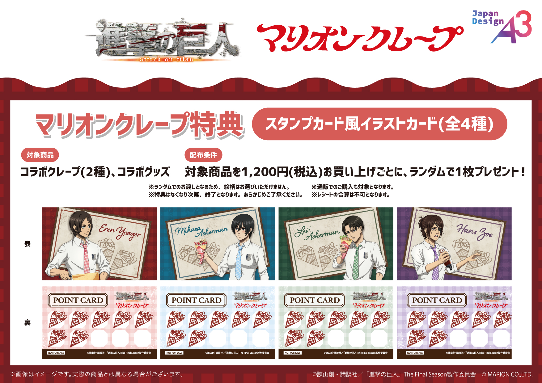 コラボクレープ(2種)・コラボグッズを1,200円(税込)ご購入ごとに、スタンプカード風イラストカード(全4種)をランダムで1枚プレゼントいたします!