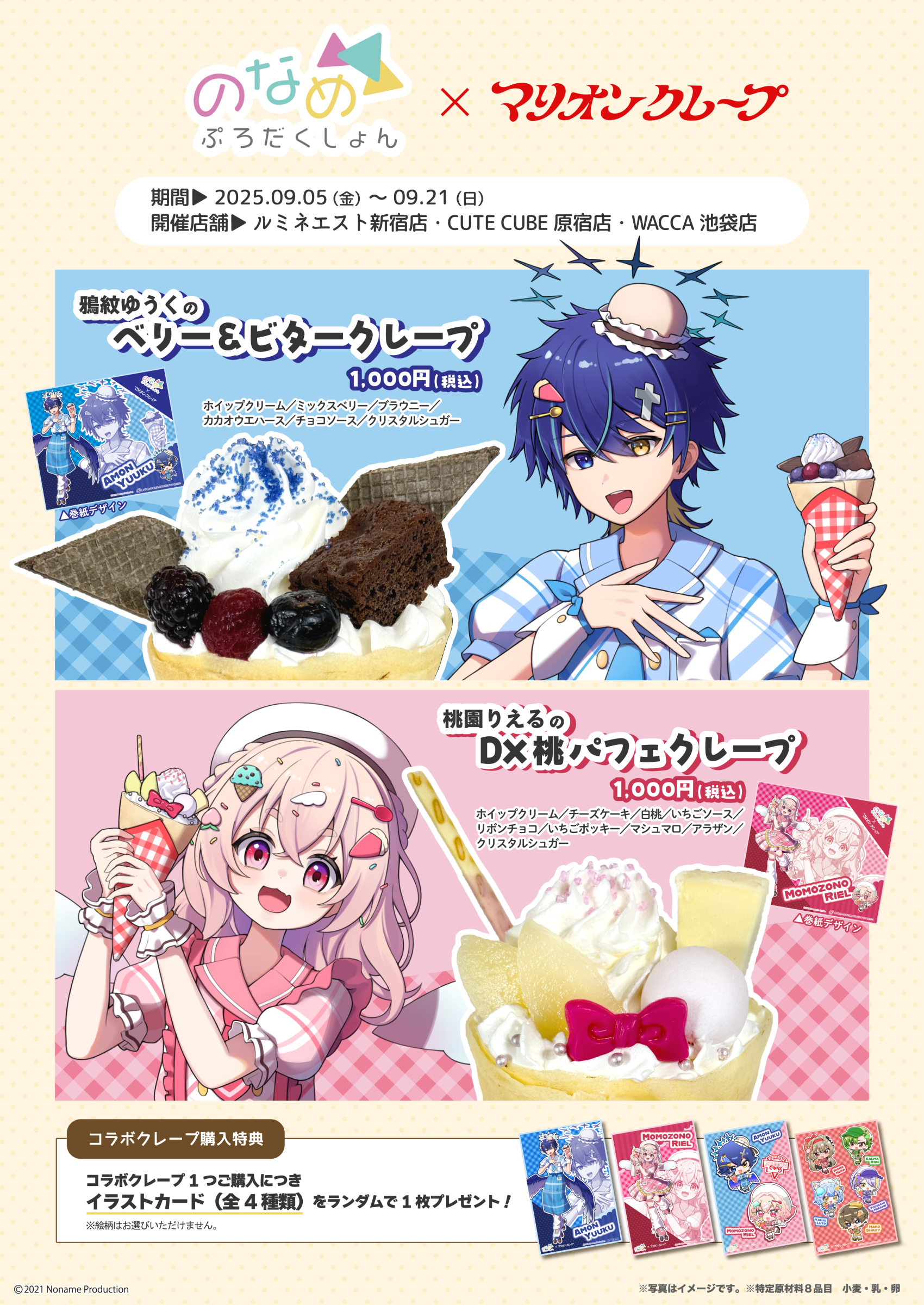 対象3店舗にて、「鴉紋ゆうく」「桃園りえる」をイメージしたコラボクレープ2種を販売いたします。