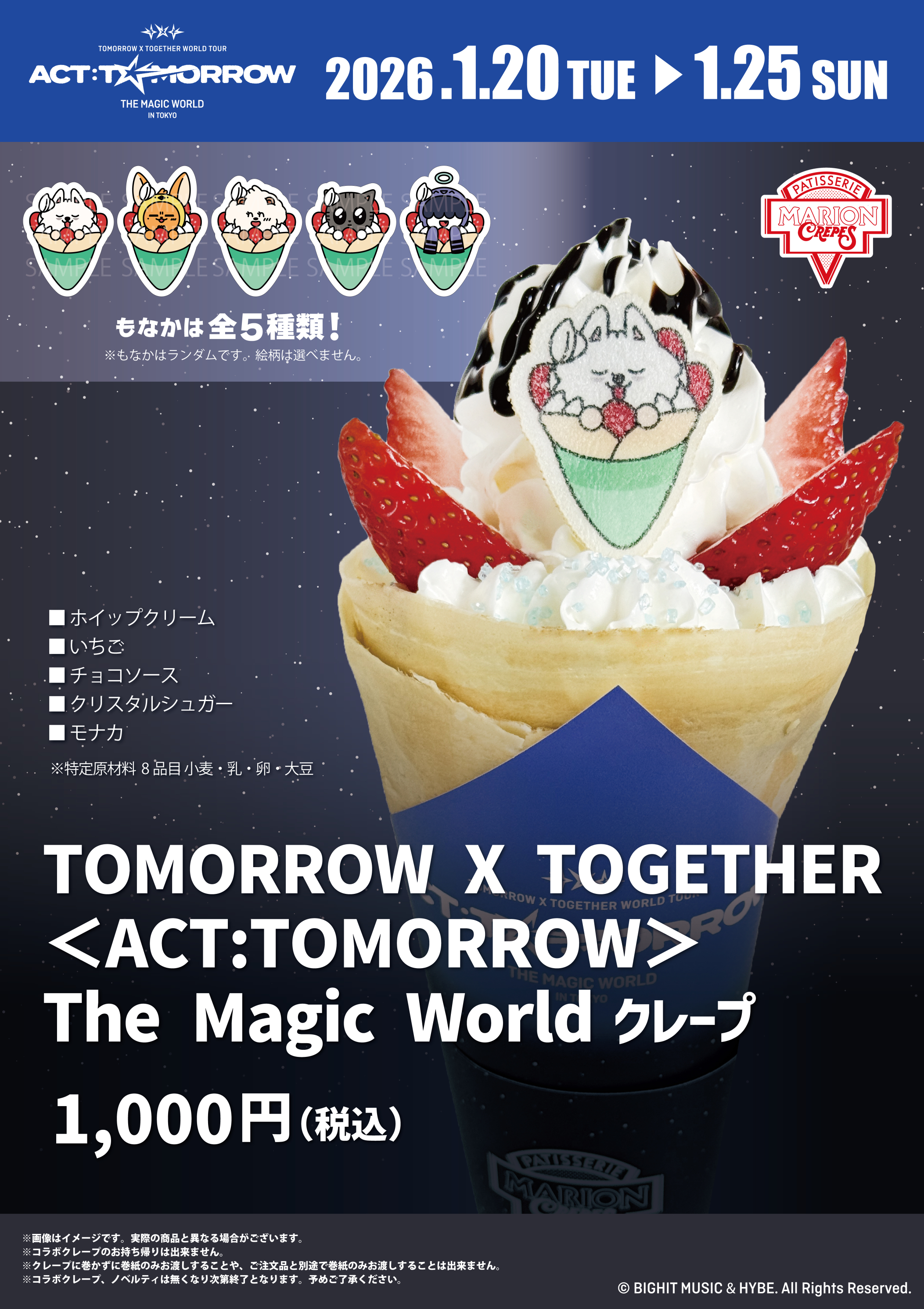 TOMORROW X TOGETHERワールドツアーの日本公演『TOMORROW X TOGETHER WORLD TOUR <ACT:TOMORROW> IN JAPAN』にあわせて展開される、コンサート連動型プロジェクト「TOMORROW X TOGETHER <ACT:TOMORROW> The Magic World in TOKYO」 の一環として、東京ドームシティ Hi! EVERYVALLEY店にてオリジナルクレープを販売いたします。
