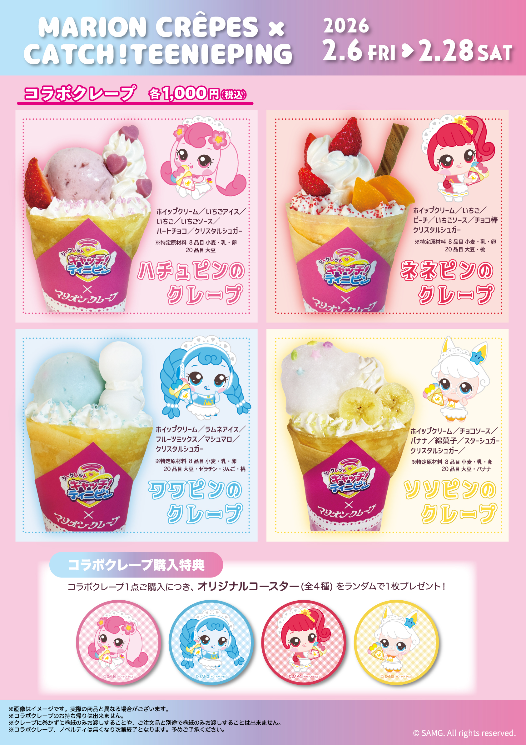 コラボクレープ1点ご購入ごとに、コースター(全4種)をランダムで1枚プレゼント!