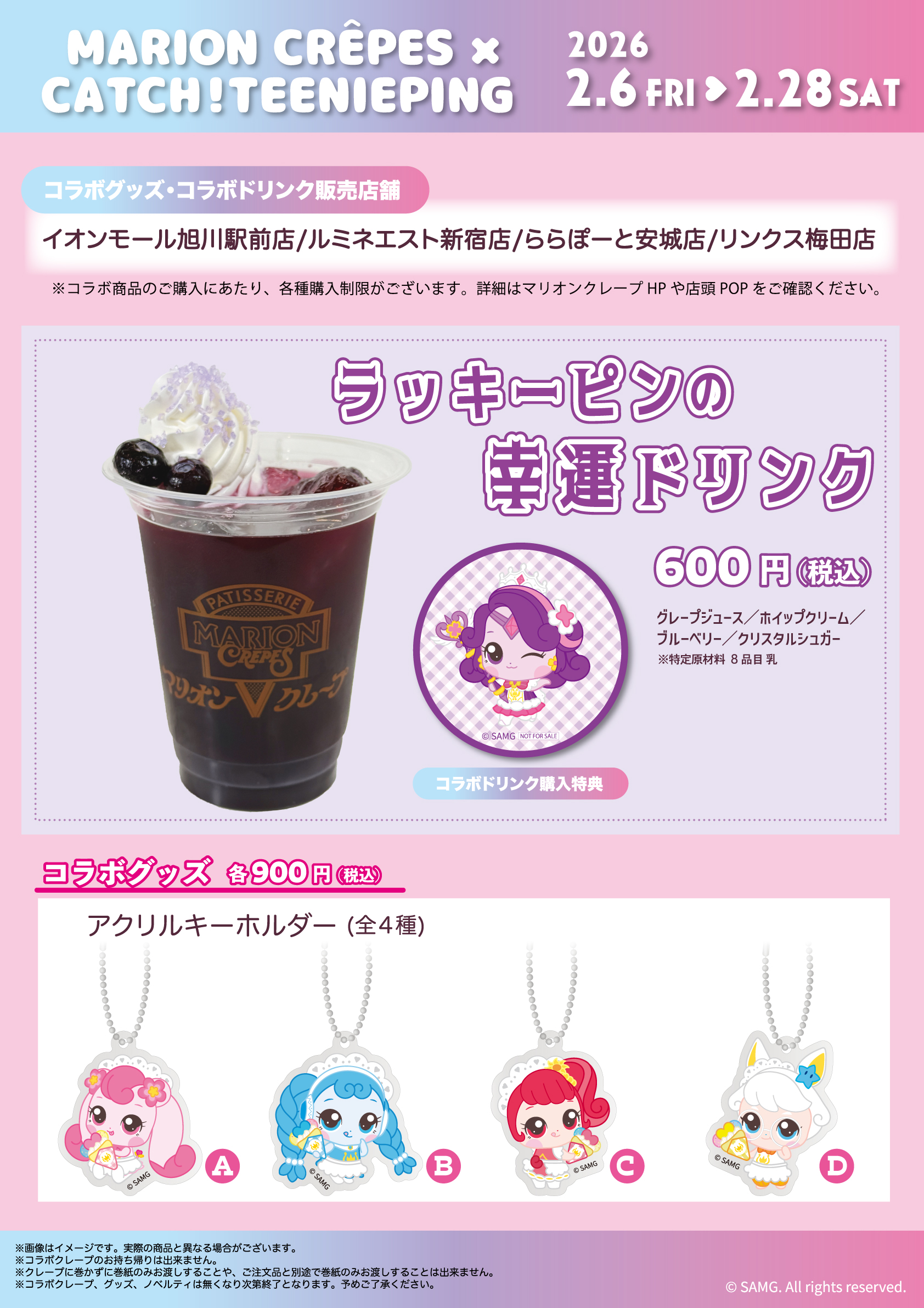 コラボドリンクとコラボグッズは下記4店舗で販売いたします!※他27店舗ではクレープのみ販売。