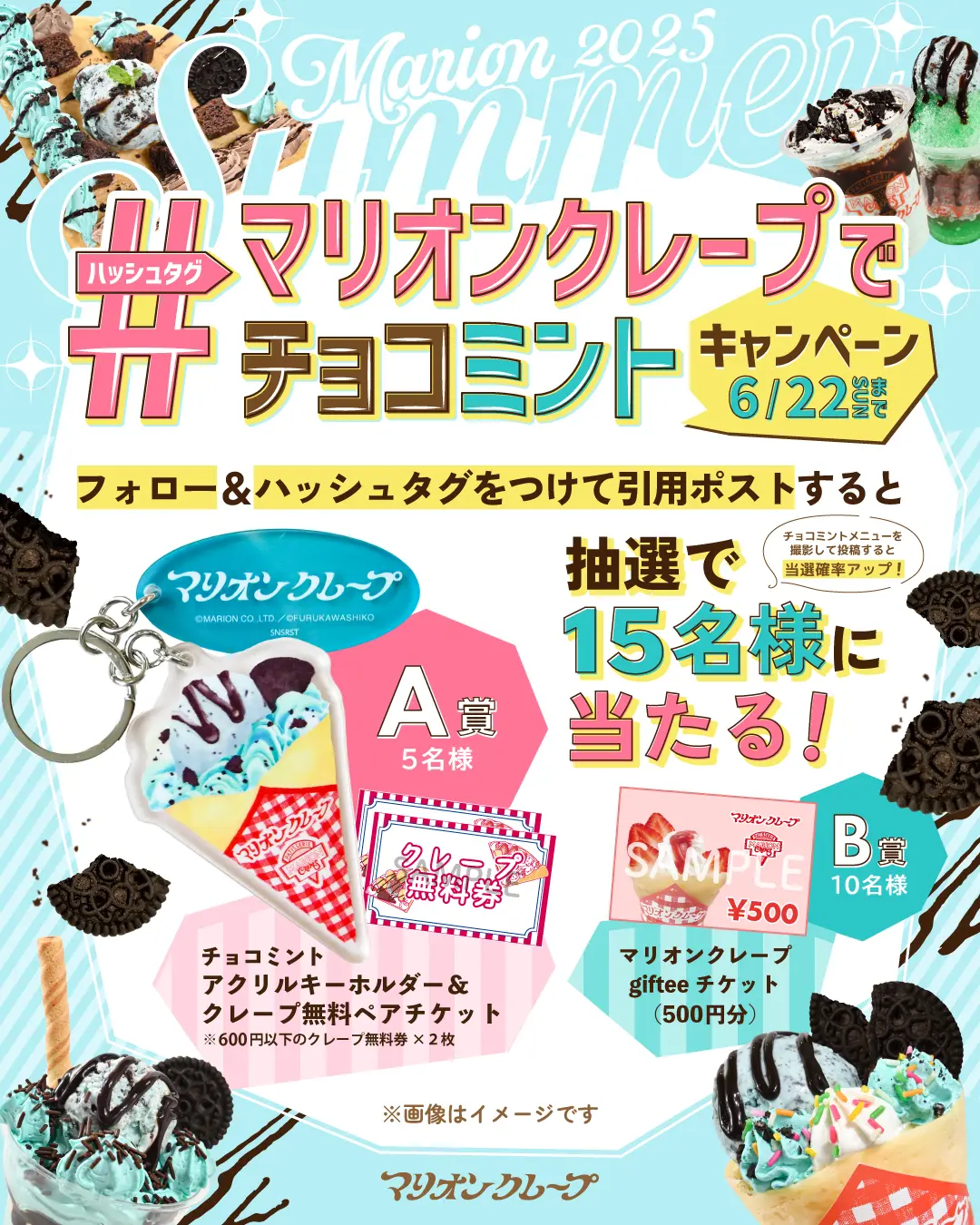 マリオンクレープでは、チョコミント好きにはたまらないSNSキャンペーンを開催中!