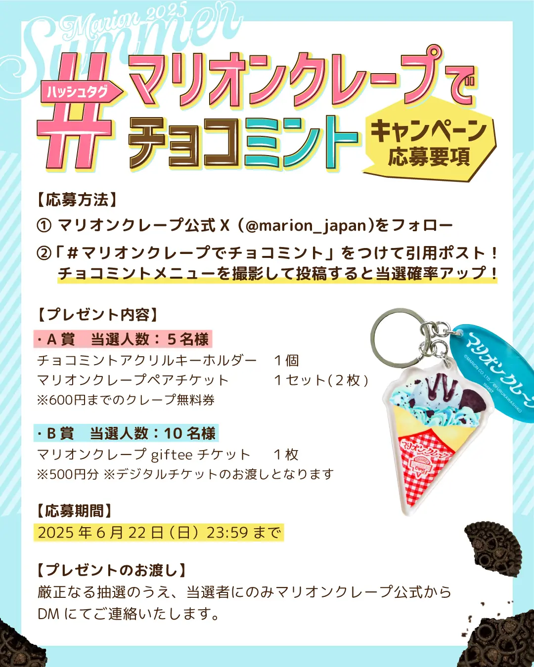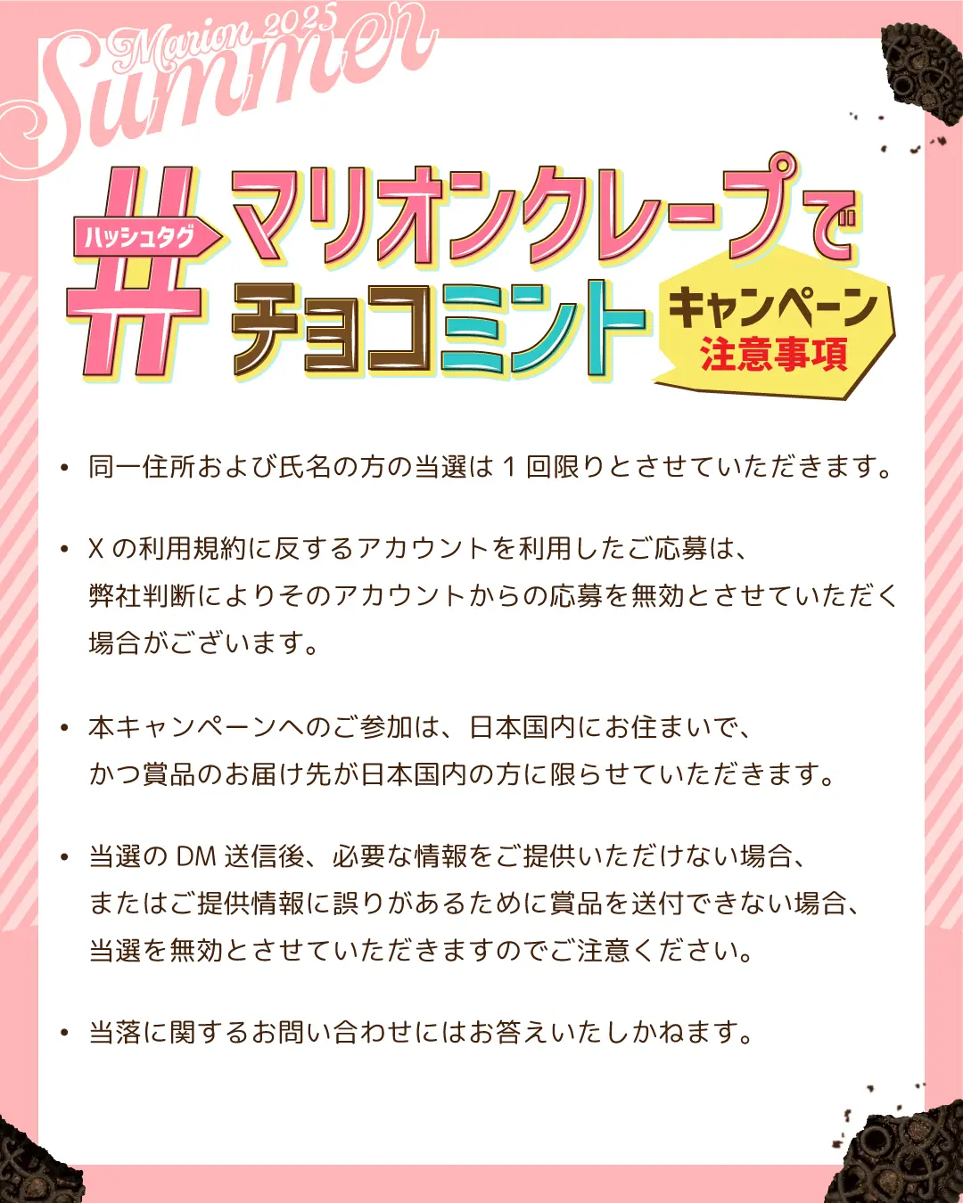 応募締切後、当選者にはマリオンクレープ公式XアカウントよりDMでご連絡いたします。