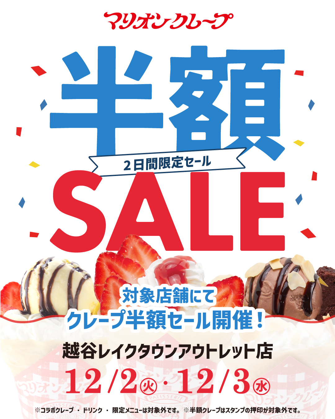 【越谷レイクタウンアウトレット店】12/2(火)・12/3(水) 半額セール開催のお知らせ