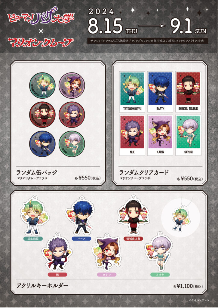 コラボクレープ3種と、マリオンクレープコラボ限定のキャラクターたちの特別書き下ろしデフォルメイラストを使用したオリジナルグッズ(ランダム缶バッジ(全6種)/アクリルキーホルダー(全6種/オープン販売)/ランダムクリアカード(全6種))を販売予定です。