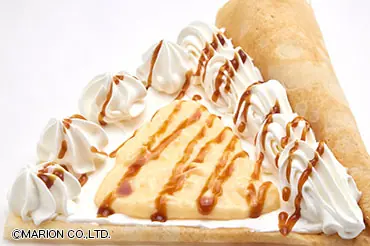 パリッと香ばしいおいもチップスとおいもの甘露煮を使用し、とろけるカスタードとキャラメルで秋の味覚を表現したおいもクレープ。