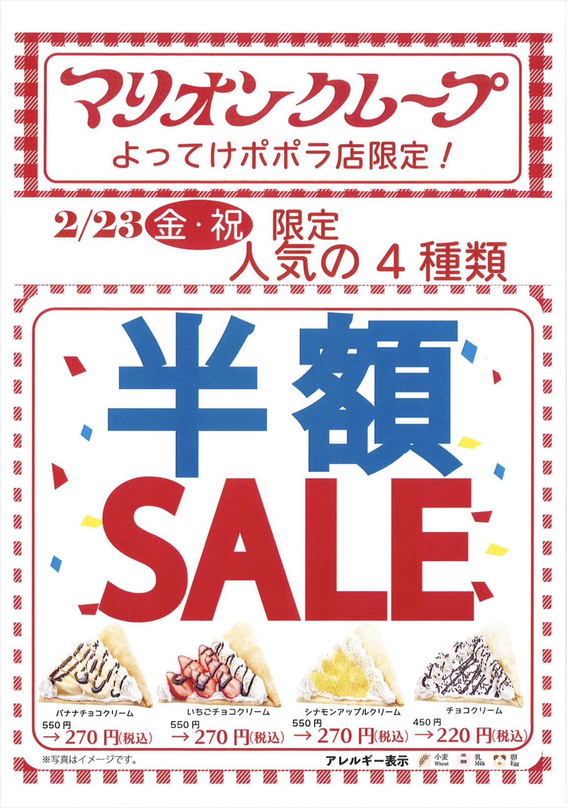 2月23日【よってけポポラ店】限定!人気の4種類クレープ半額のお知らせ