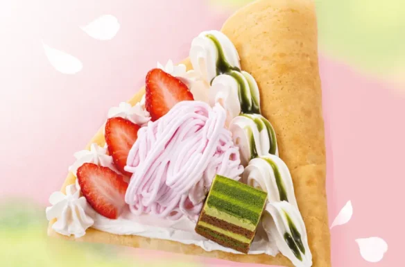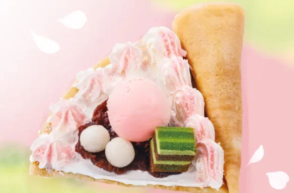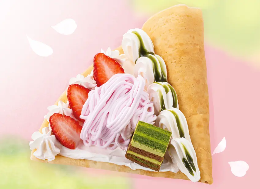 さくらアイスにふわふわの抹茶ケーキ、さくら風味の桜チョコシェイブを合わせました。ほんのり桜が香る、至福の春色クレープ。
